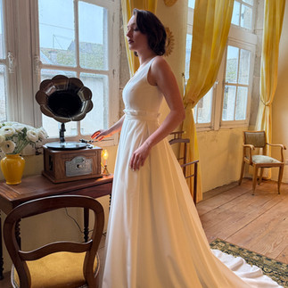 Chaque robe dialogue avec les lieux. Les moulures, les tissus anciens, la lumière douce d’hiver… tout fait sens. Ici, la robe ne se contente pas d’être portée : elle habite l’espace.